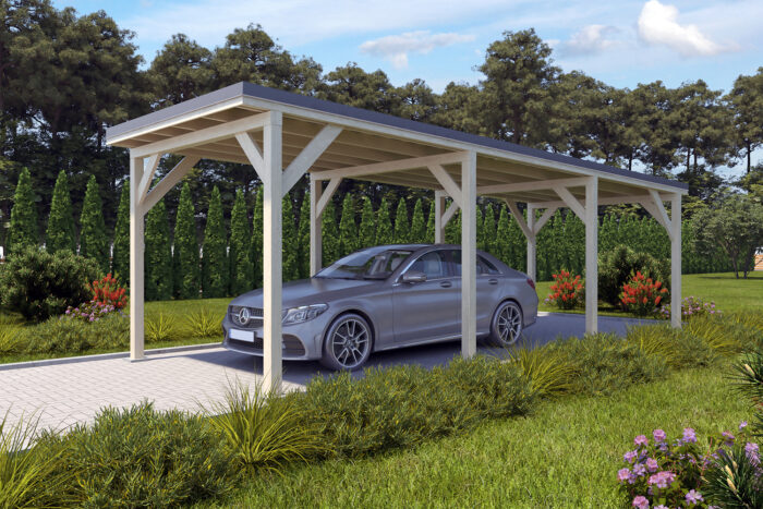 The support posts and load-bearing beams of the car shelter are made of glulam, all other construction material is grade C24 planing material.